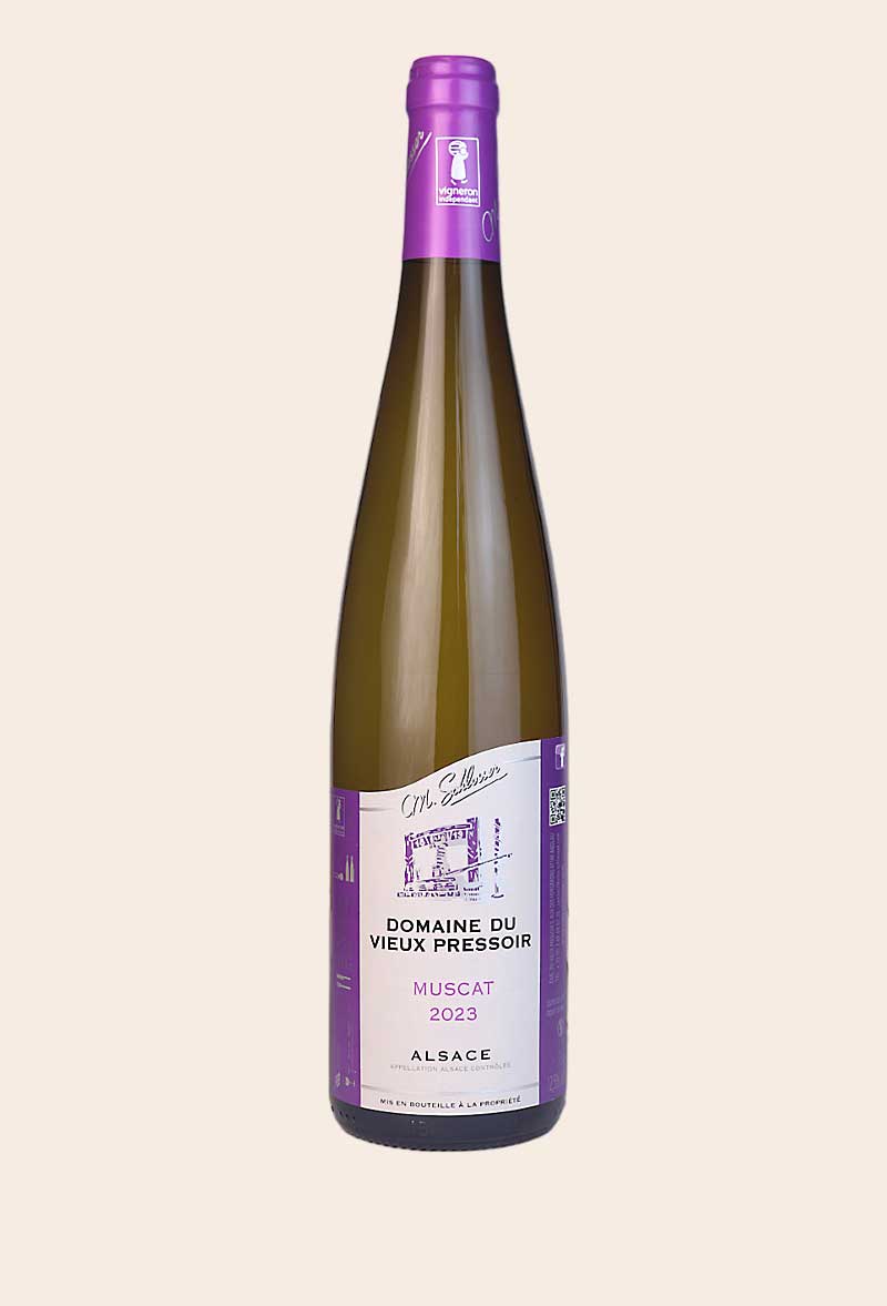 Muscat 2023, bilé suche víno, vinařství Schlosser, Alsasko.